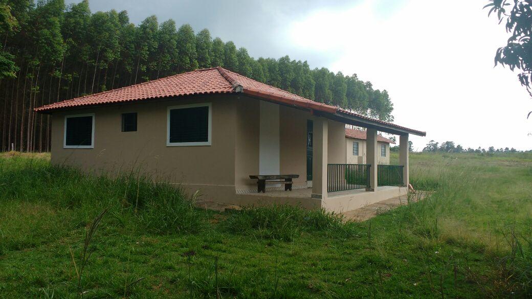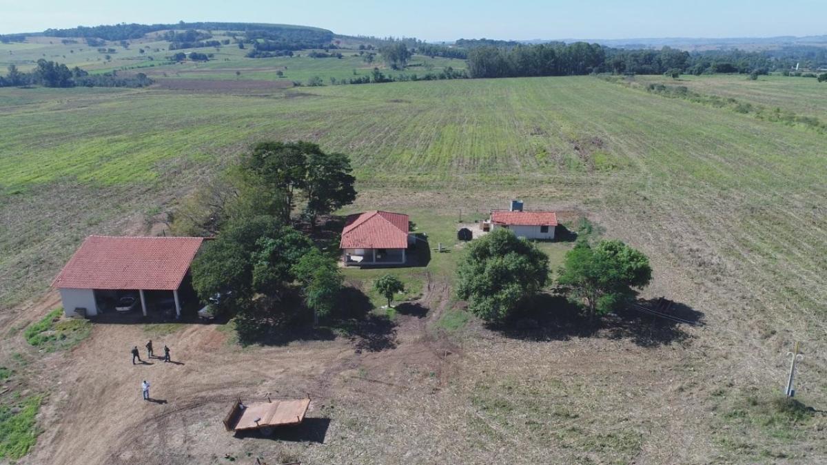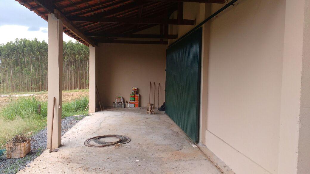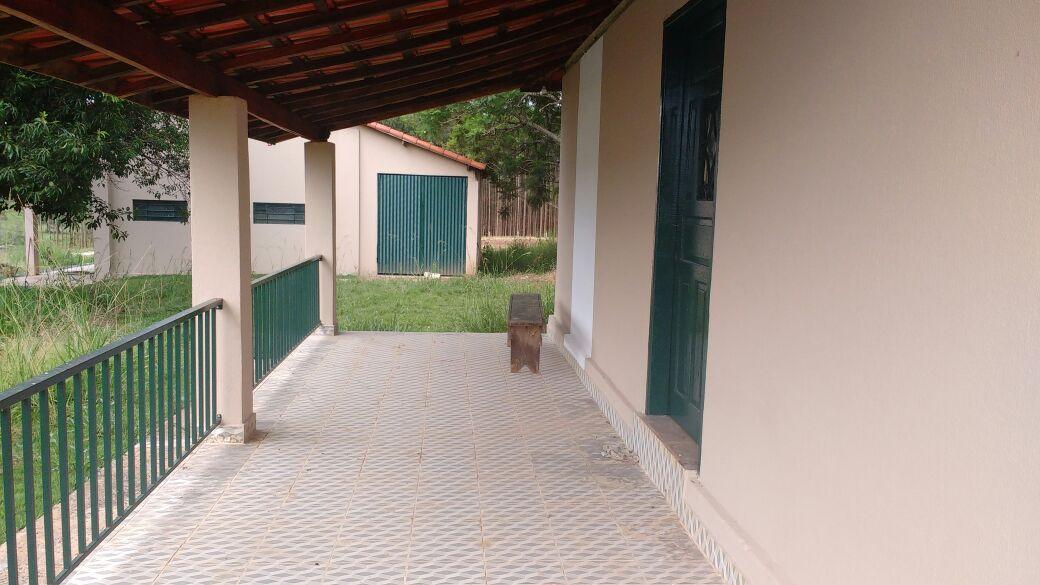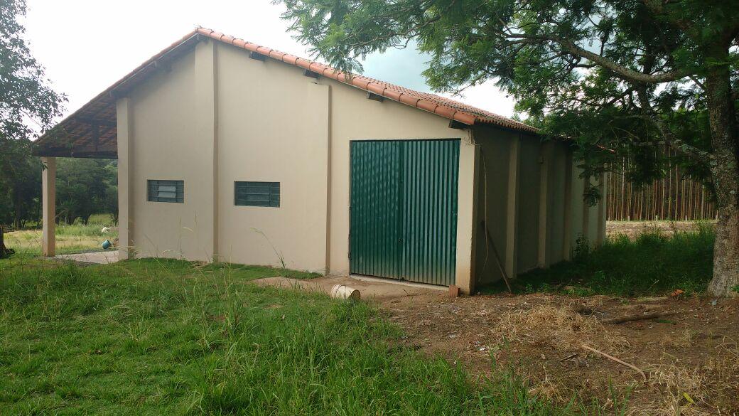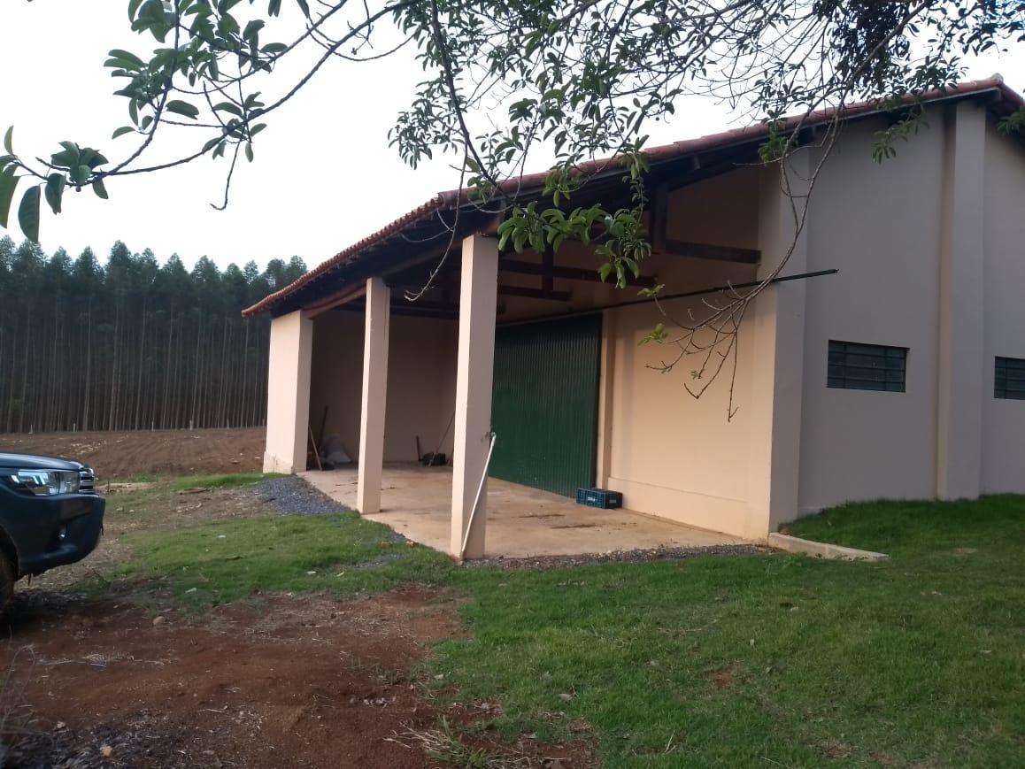 Propriedade rural com casa sede simples, varanda ampla, casa de caseiro de pequeno porte e um barracão grande totalmente fechado.